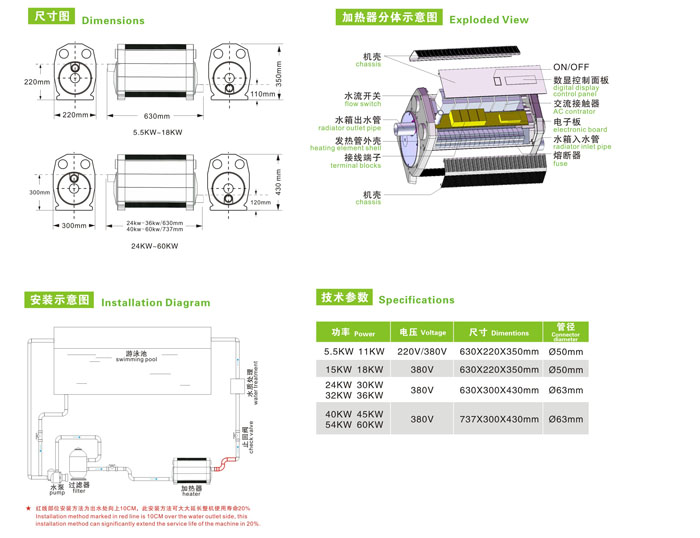 這是一款專為泳池/SPA設(shè)計的專業(yè)電加熱恒溫設(shè)備,其擁有智能觸控,操作簡單,多重安全保護,鋁合金精美外殼,簡易售后的特點。耐腐蝕全不銹鋼水箱,及鎳鉻鐵合金加熱管讓其壽命倍增。